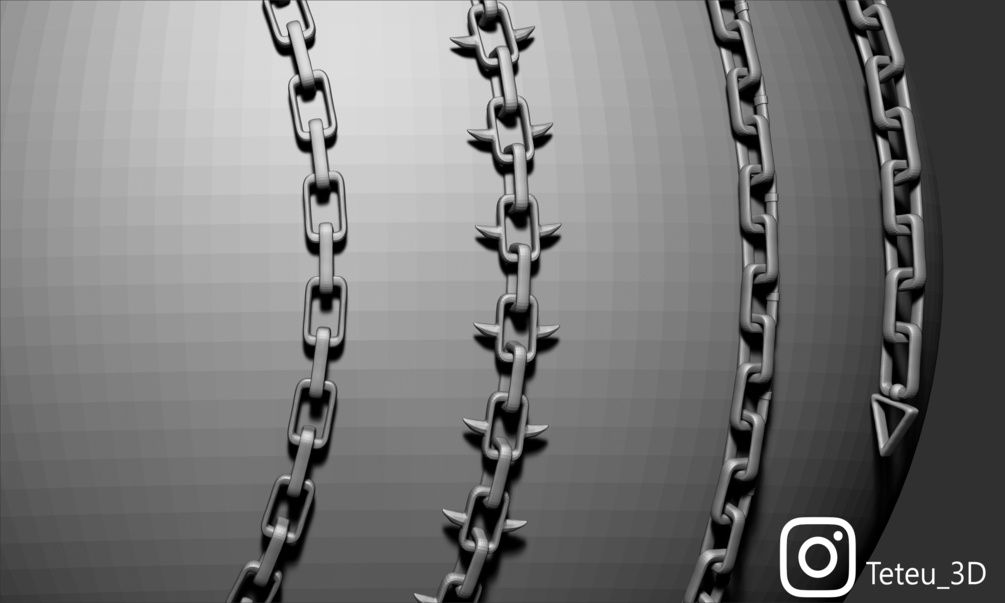 a Pack of chain brushes made in Zbrush by me, there are 4 models of chains compatible with Curve Mode, one of them being a 3 parts chain.